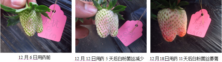 幼果期草莓用太抗后白粉菌絲逐漸減少、萎蔫